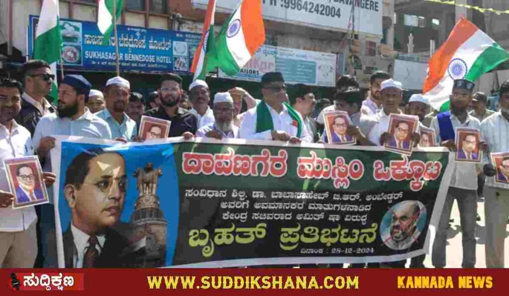 ದಾವಣಗೆರೆ: ಬಾಬಾ ಸಾಹೇಬ್ ಡಾ. ಬಿ. ಆರ್. ಅಂಬೇಡ್ಕರ್ ಅವರಿಗೆ ಅಪಮಾನಕರವಾಗಿ ಮಾತನಾಡಿರುವ ಕೇಂದ್ರ ಗೃಹ ಸಚಿವ ಅಮಿತ್ ಶಾ ರಾಜೀನಾಮೆ ನೀಡುವಂತೆ ಒತ್ತಾಯಿಸಿ ಮುಸ್ಲಿಂ ಒಕ್ಕೂಟದಿಂದ ಪ್ರತಿಭಟನೆ ನಡೆಸಲಾಯಿತು.