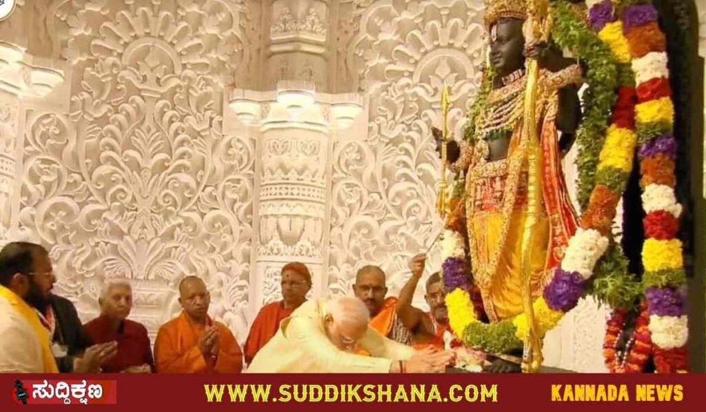 ಅಯೋಧ್ಯೆಯಲ್ಲಿ ಅದ್ಧೂರಿ ಆಚರಣೆಗಳ ನಡುವೆ ನೂತನ ರಾಮಲಲ್ಲಾ ಮೂರ್ತಿಯನ್ನು ಪ್ರತಿಷ್ಠಾಪಿಸಲಾಯಿತು. ಧಾರ್ಮಿಕ ವಿಧಿವಿಧಾನಗಳ ನೇತೃತ್ವ ವಹಿಸಿ ರಾಮಲಲ್ಲಾ ಮೂರ್ತಿಯ ಕಣ್ಣುಗಳನ್ನು ಅನಾವರಣಗೊಳಿಸಿದ ಮೋದಿ,